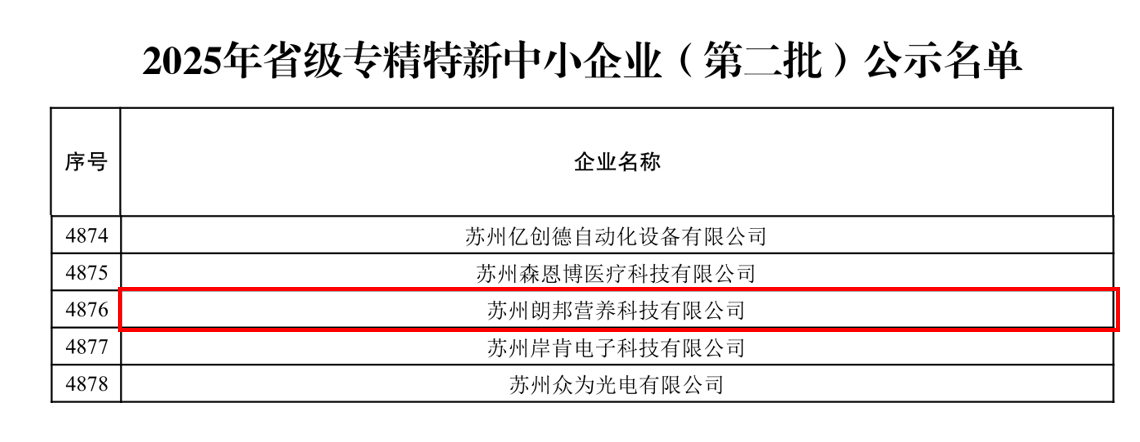朗邦营养喜获”专精特新“企业认定发表时间:2025-12-05 16:23 近日,江苏省工业和信息化厅公布了2025年专精特新中小企业认定通过名单,我司苏州朗邦营养科技有限公司名列其中 ![]() ![]() “专精特新”中小企业,是指具有“专业化、精细化、特色化、新颖化”四大特征优势的企业。“专精特新”中小企业称号是全国中小企业评定工作中最具权威、最高等级的荣誉称号。